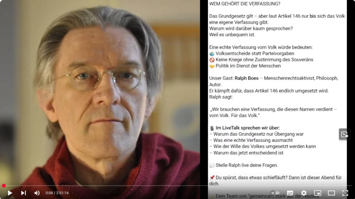 Radio München: Podcast - Great Reset von unten Jasmin Kosubek: Interview: Der Staat achtet das Grundgesetz nicht mehr - in keinem einzigen Punkt Soufisticated: Interview: Wir brauchen eine neue Verfassung vom Volk TKP: Blogbeitrag: Wie kommt Deutschland zu einer Verfassung? Corona-Ausschuss: Interview: Das Brodeln: Gespräch über das Buch Pravda: Text und Video: Systemkritiker Ralph Boes: „Der Staat achtet das Grundgesetz nicht mehr Apolut: Interview: Great Reset von unten Kayvan Soufi-Siavash: Video: Wir halten die Käfigtüre von innen zu! Es wird Zeit, dass wir uns auswildern (ab Minute 18:20)