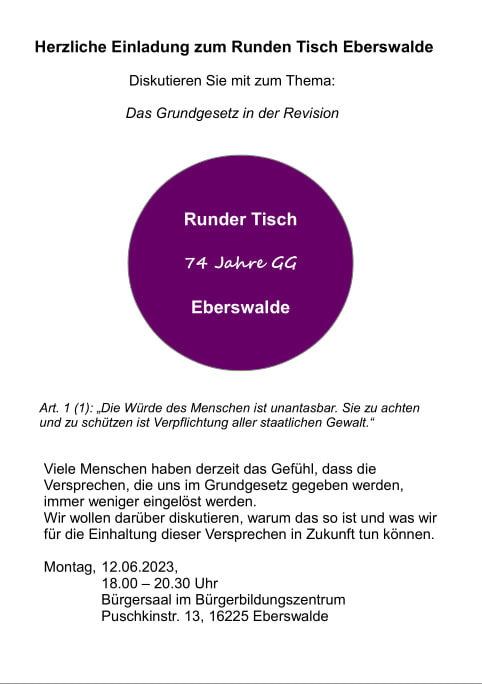 Einladung zum "Runden Tisch Eberswalde" 12. Juni 2023 18:00 - 20:30 Uhr Mit Ralph Boes | Bürgerdialog | Moderation Jenny Ehlert