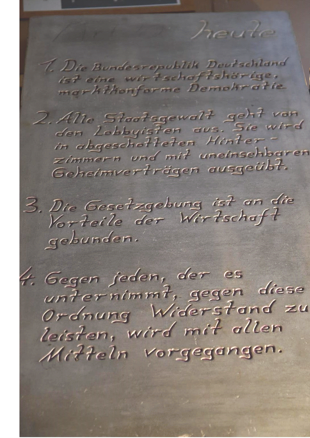 (1) Die Bundesrepublik Deutschland ist eine wirtschaftsgesteuerte, marktkonforme Demokratie(2) Alle Staatsgewalt geht von den Lobbyisten aus. Sie wird in abgeschotteten Hinterzimmern mit uneinsehbaren Geheimverträgen ausgeübt(3) Die Gesetzgebung ist an die Vorteile der Wirtschaft gebunden(4) Gegen jeden, der es unternimmt, gegen diese Ordnung Widerstand zu leisten, wird mit allen Mitteln vorgegangen.
