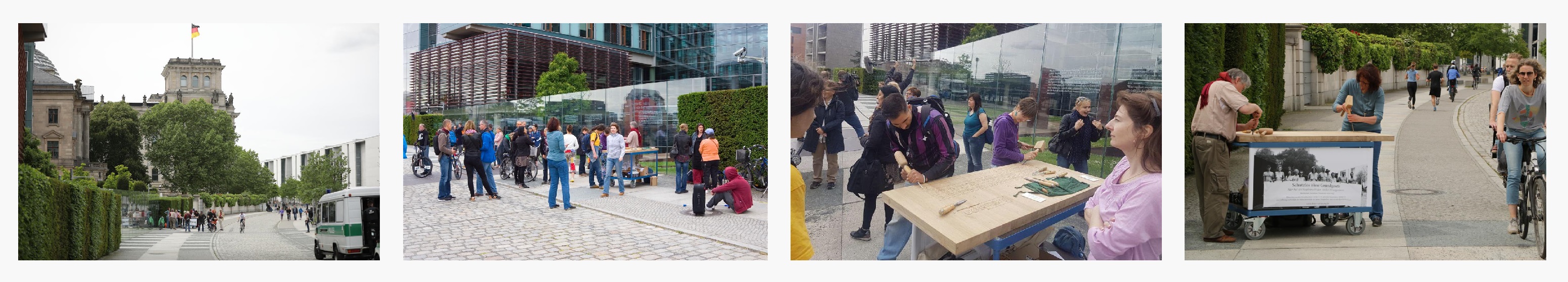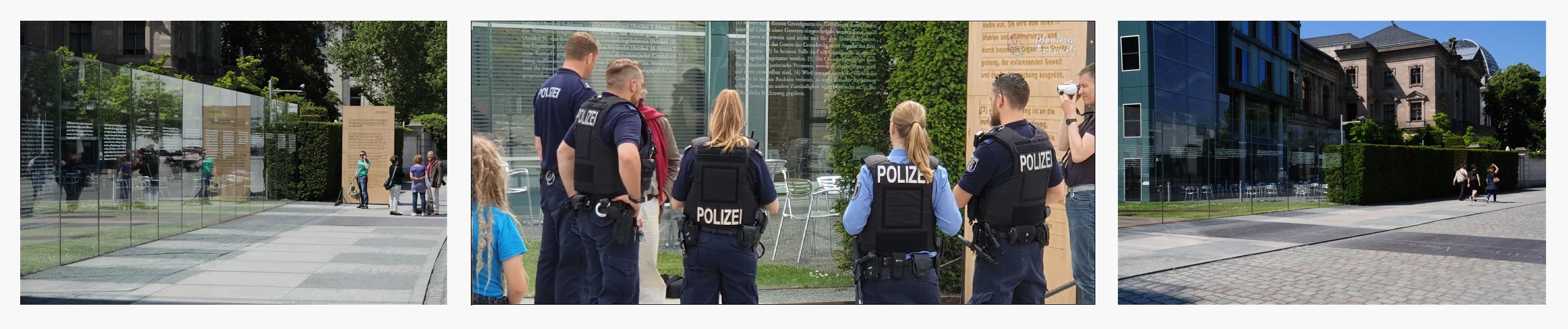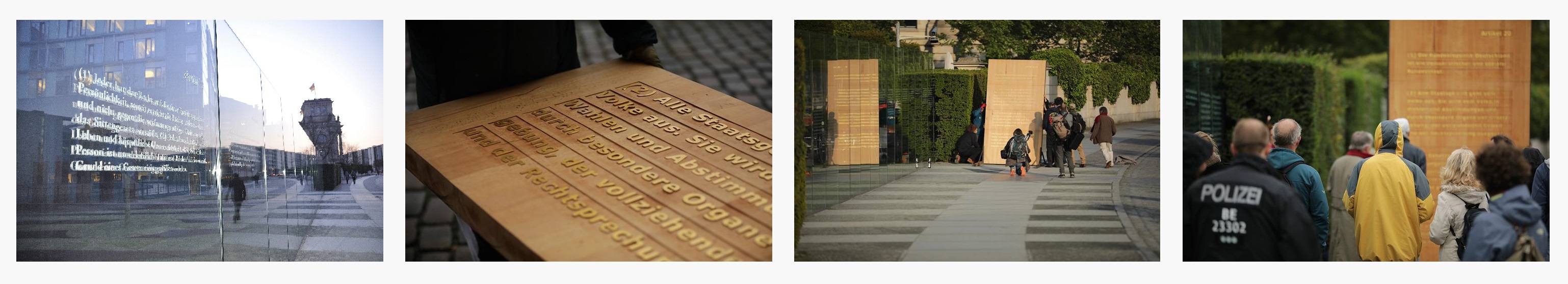 Da das Grundgesetz systematisch schon lange außer Kraft gesetzt wird, haben wir im Jubeljahr zum 70. Geburtstag des Grundgesetzes 2019 am Stelenkunstwerk Dani Karavans "Grundgesetz 49" am Bundestag den dort fehlenden Artikel 20 GG in Buche mit Gold errichtet. Einmal direkt zum Geburtstag des Grundgesetzes am 23.05. und ein weiteres Mal für die Frist vom 03.10. (Tag der deutschen Einheit) bis zum 9.11.2019 (30ter Feiertag des Mauerfalls) |