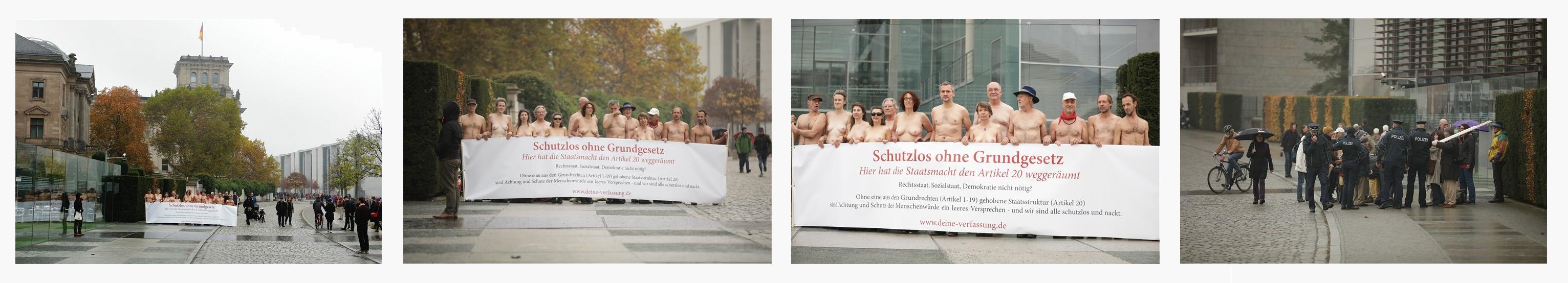 Plakattext: Schutzlos ohne Grundgesetz. Hier hat die Staatsmacht den Artikel 20 weggeräumt. Rechtsstaat, Sozialstaat, Demokratie nicht nötig? - Ohne eine aus den Grundrechten (Artikel 1 bis 19) gehobene Staatsstruktur (Artikel 20) sind Achtung und Schutz der Menschenwürde ein leeres Versprechen - und wir sind alle schutzlos und nackt!