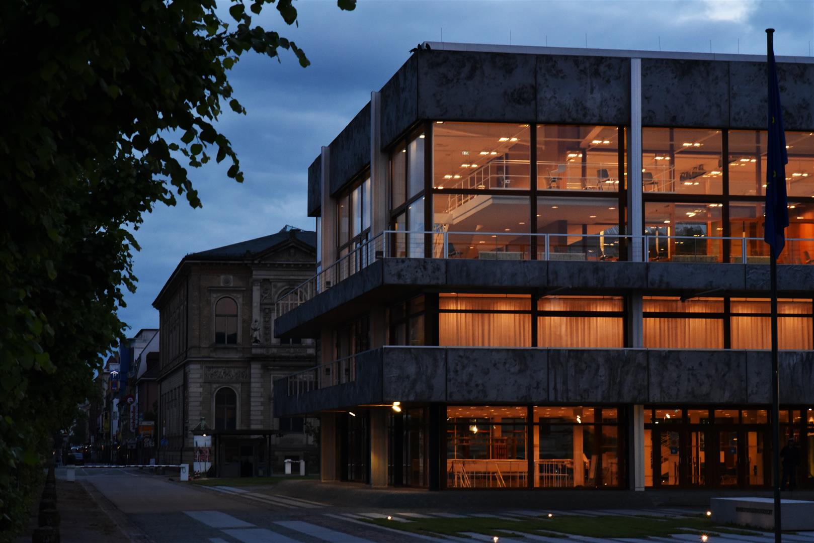 An der Stirnseite des langen Tisches steht das Grabmal des Grundgesetzes |